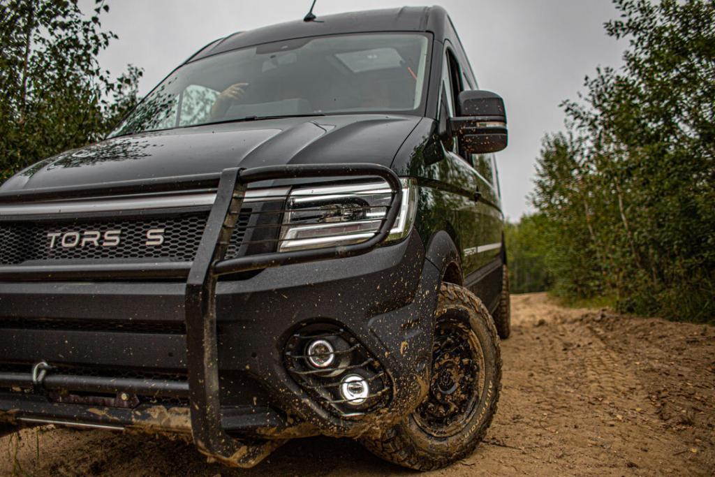 Walking around the Terrastorm, the rear and side views leave little doubt as to its heritage. The front, on the other hand, still bears the factory silhouette but with some facelift surgery setting it apart from its TGE brothers and Crafter cousins. Other than the TORSUS logo embellishing the grill, the brand’s signature manifests itself beneath the waistline with two offset pairs of additional driving lights integrated into the sculpted valance.