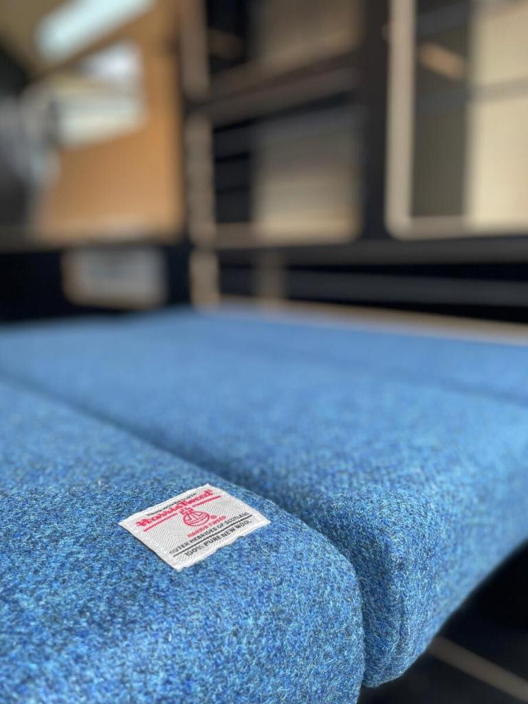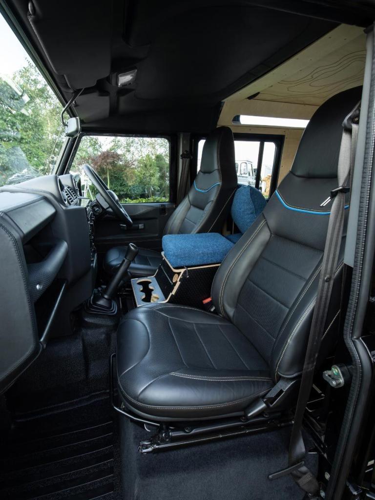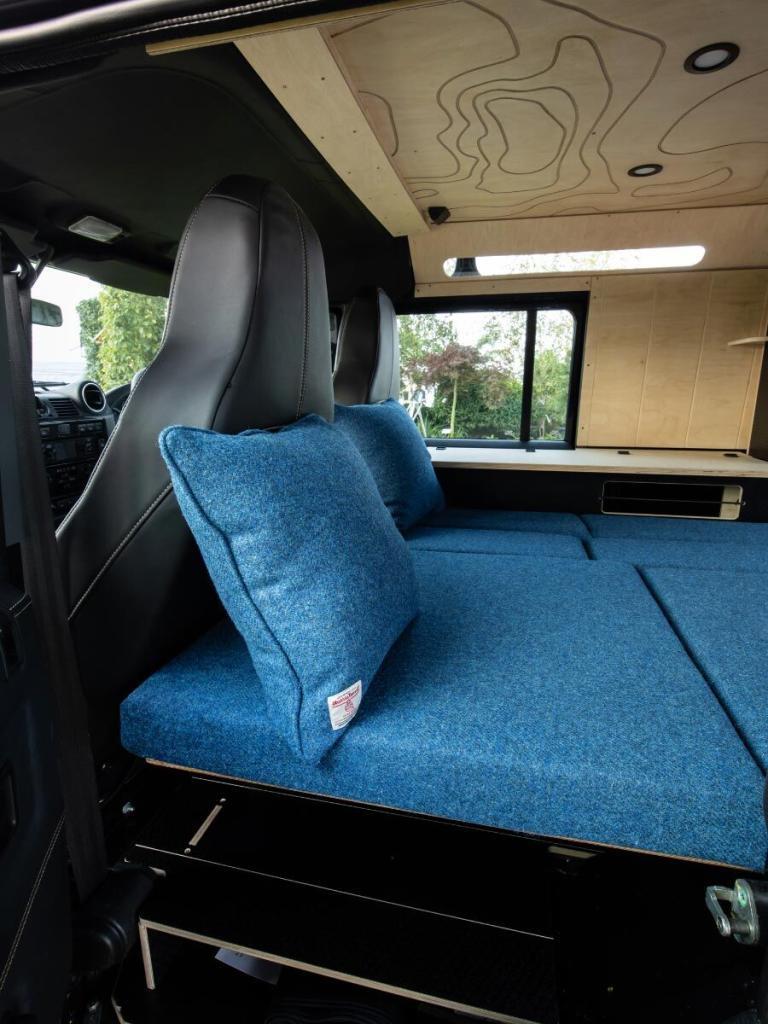 Other enhancements delivered by the specialist team at Land Rover Classic include a bespoke interior, consisting of premium front seats with contrast stitching in yellow and electric blue piping, tied in with Harris Tweed on the centre console and the rear benches. The fully approved conversion by camper specialists, The Ply Guys, ensures the Defender is ready for anything. The hand-crafted furniture is built with adventure in mind, featuring modular components that can be specified in one of many combinations.