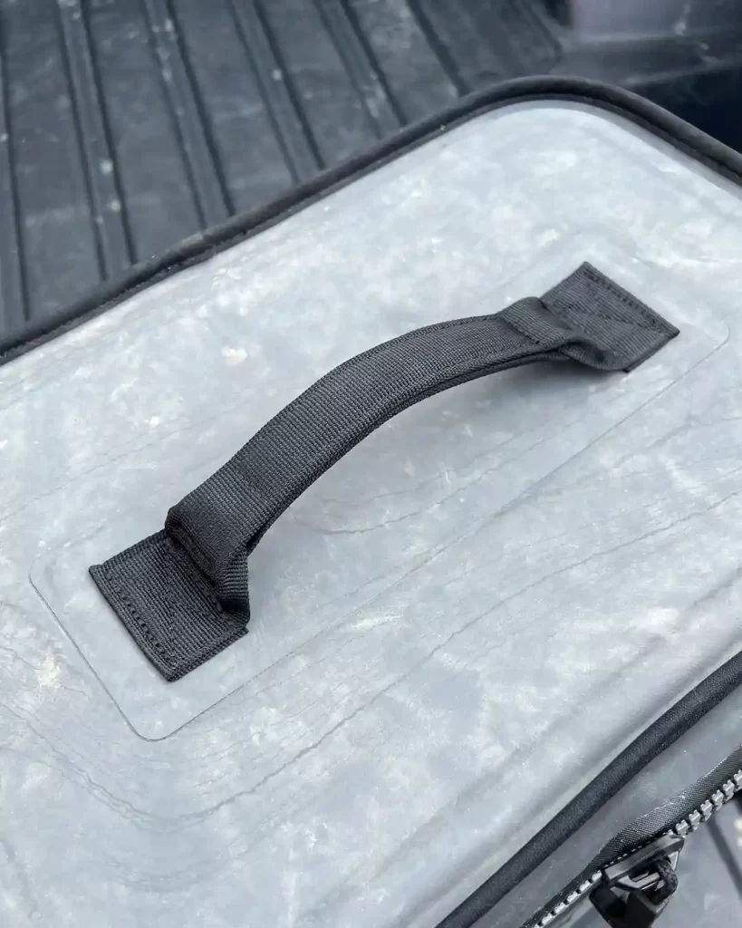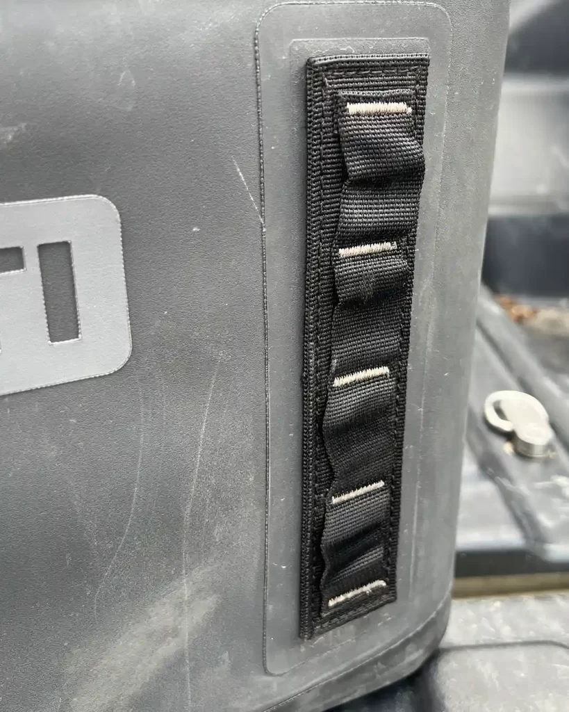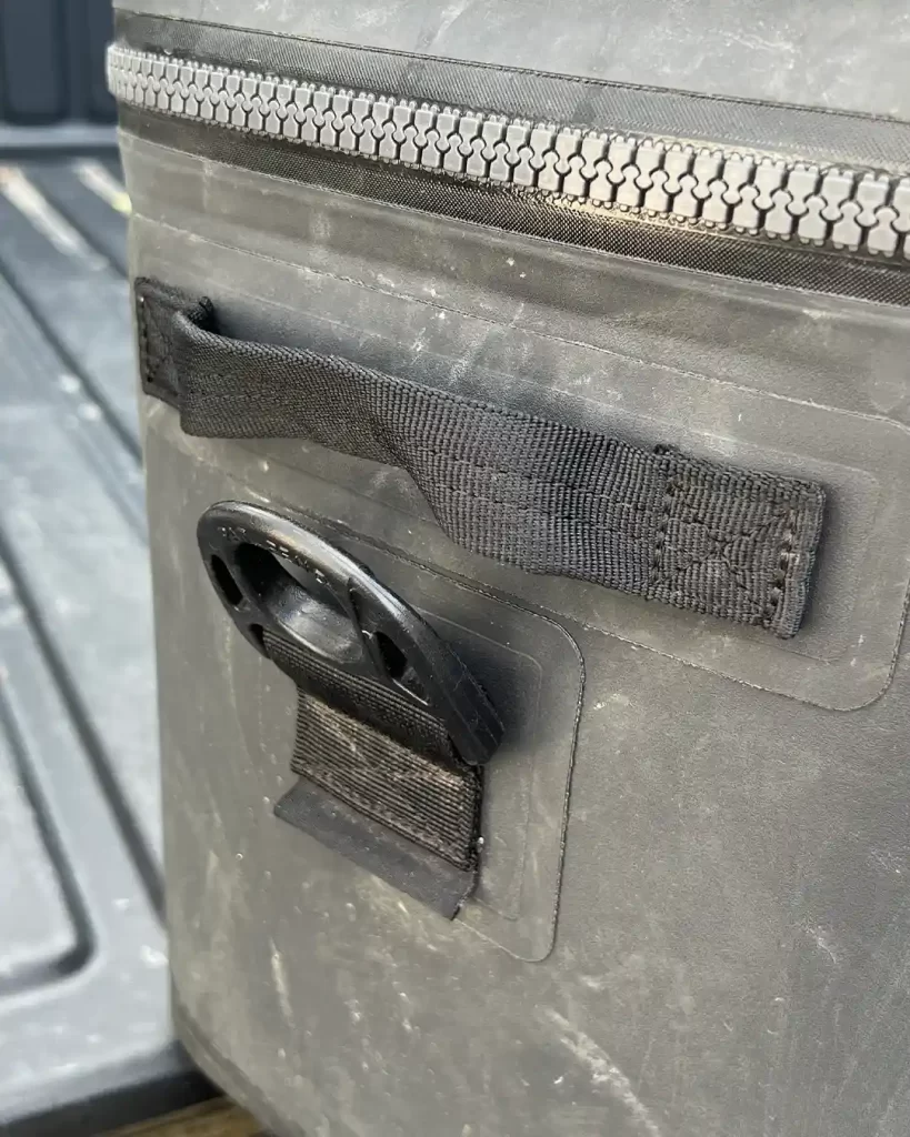 There is a carrying handle on each side along with robust hooking points for the shoulder strap. The front and rear have two rows each of four daisy chains for attaching smaller items. There is also a grab handle near the top edge at the rear (which I used to loop through a ratchet strap to keep the cooler in place on rough tracks) – ideally, I would like a similar loop at the bottom so that I could use them together to secure the cooler with a single strap and still be able to open the lid. The main carrying handle is attached to the lid.