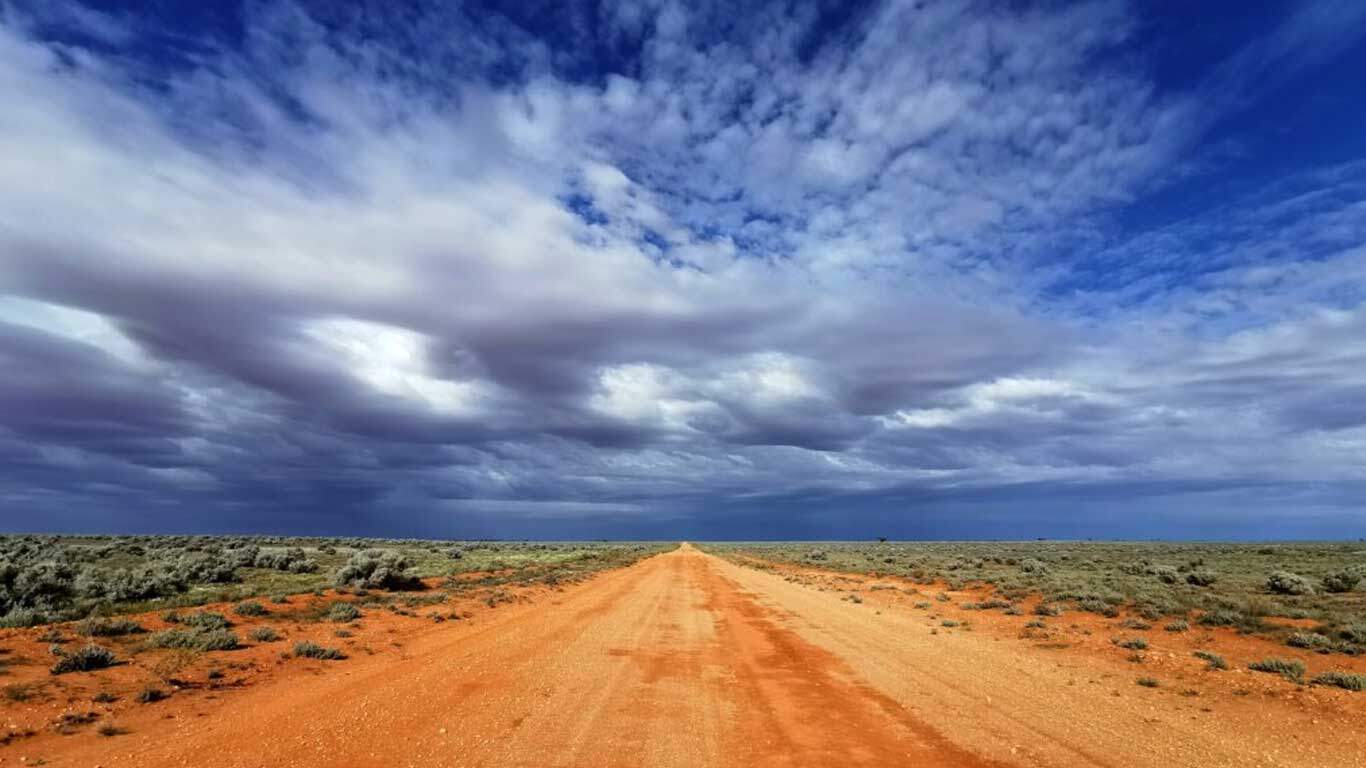 Fortunately the wind died down overnight. I made short work of the last 15km of the Tjuntjuntjara Road and turned south on to the Connie Sue Highway, another of Len Beadell’s road network, this one named after one of his daughters, Connie Sue. The section of the Connie Sue Highway I followed had been upgraded as a part of the route from Tjuntjuntjara to Kalgoorlie and was a decent gravel road compared to the rest of the Connie Sue, which is essentially two wheel ruts. I enjoyed a tailwind to begin with, but then the skies darkened with some heavy rainclouds, the wind switched to a headwind, and the Heavens opened just as I caught up with the vehicles for the first break of the day.