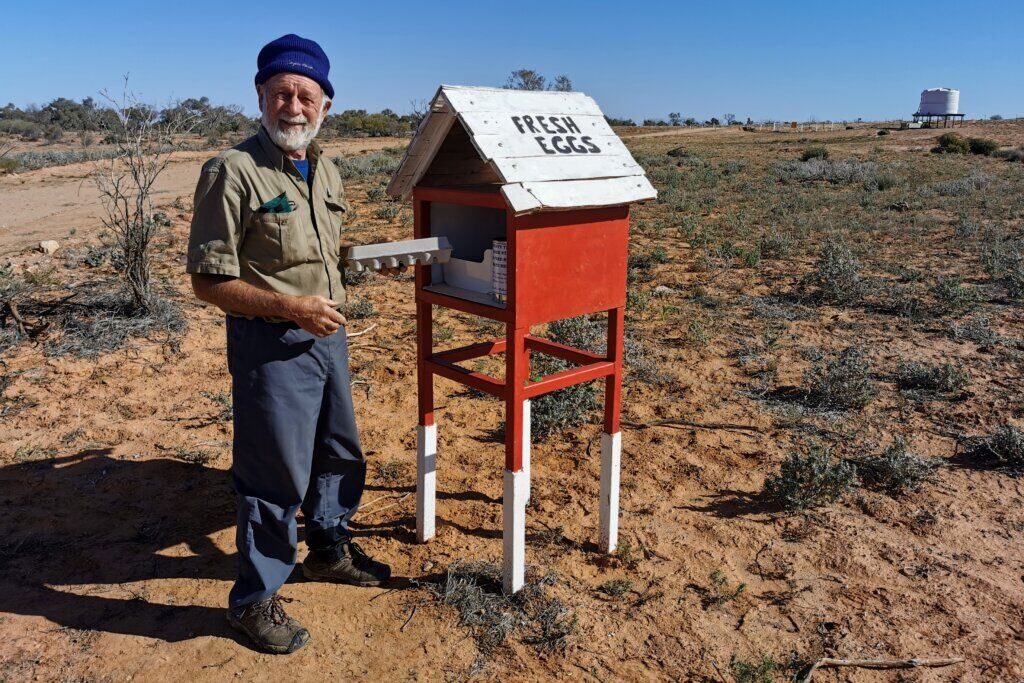 Matthew’s parents Trevor and Helen live and manage the first of their seven properties in the region, Nilpinna, 70km north of William Creek, a neighbouring property to Anna Creek. En route to a meeting at William Creek Hotel, Trevor diverted to where we were camped beside Anna Creek to meet us. Understandably guarded at first, he soon opened up and agreed to do an interview, driving Gelareh and I to the nearest cattle yards to do the filming.