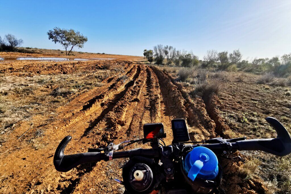 The ride from Beresford Siding (Old Ghan, Oodnadatta Track) to Anna Creek was a short 68km, although the stiff headwind didn’t give it to me easily. The first 20km was stoney and corrugated with no tree cover to protect me from the wind. There were several muddy water crossings, which I negotiated with the all-wheel drive system switched on, and there was a lot of water still flooding the landscape in between the dunes. The rest of the ride was over a smoother, clay-based surface, which I appreciated. About 15km east of William Creek, I stopped to photograph an impressive jump-up, the lower level I guessed was on the Lake Eyre floodplain.