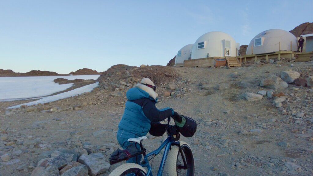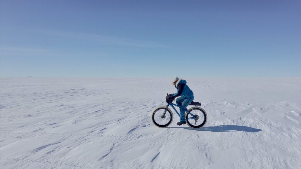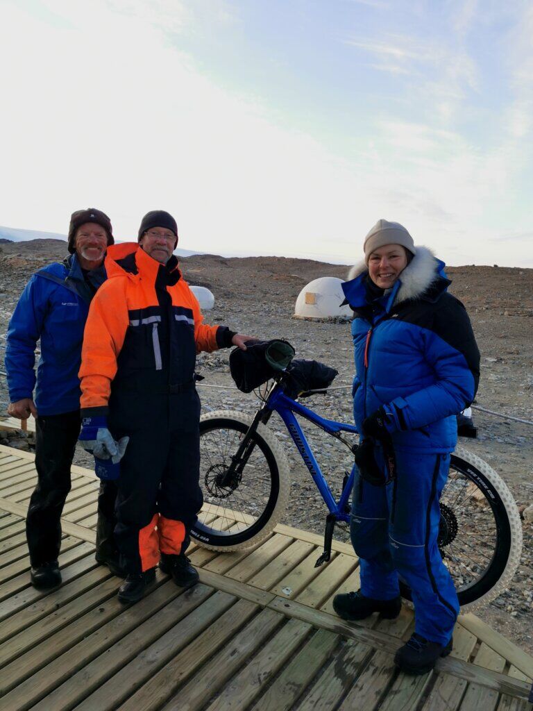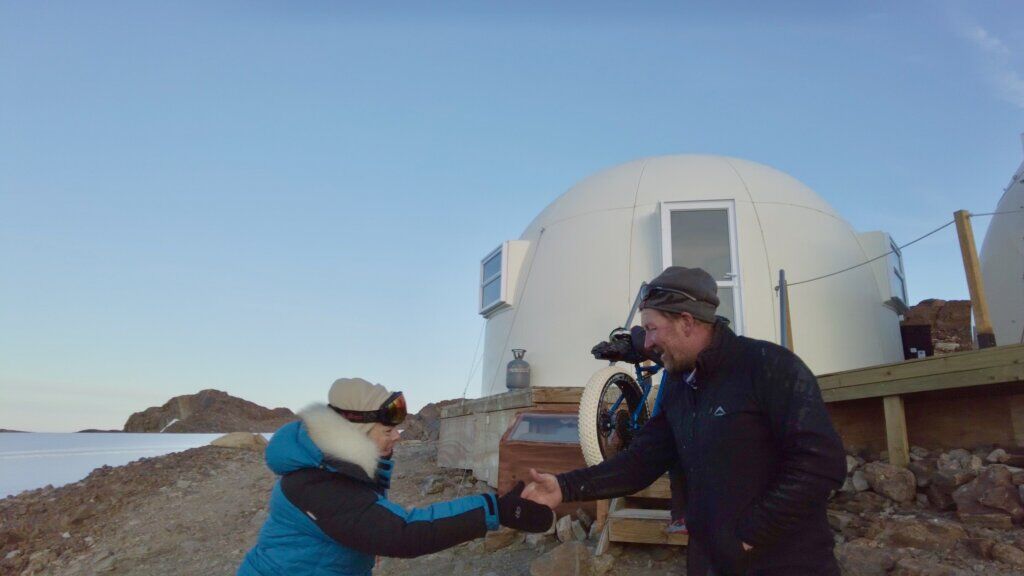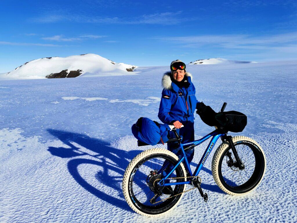 From there we picked up an ice road that descended almost 500m to Schirmacher Oasis. I again had to hold my nerve on the first part of the descent as the track was almost pure ice apart from tiny strips of snow, which I clung to. I could only brake gently on the snowy patches to control the speed. After that, White Desert had made a beautifully groomed piste down a spectacular descent, leading all the way to Whichaway Camp and the finish. The final 250m was treacherous and I slipped one more time on the ice before walking the bike into camp.