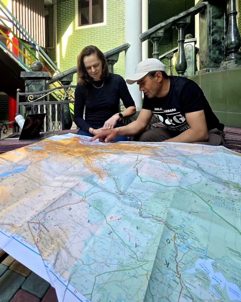 The border crossing after 90km was a real challenge. Our drivers are unable to cross the border so Georgia and I had to walk, carrying our gear across – initially cart operators took our bags and I cycled, but then came the hassle of customs and immigration, all while I was freezing cold and wet. The process took about 90 minutes – and on the other side, I found our new driver, Samvel in the car park holding up my name – he doesn’t speak any English and didn’t seem to have any idea of what to do except we needed to get to the nearest town, Buka, another 30km away. This ended up being a white knuckle ride – it was the main road to Tashkent, there was a lot of traffic and it was getting dark. It was such an epic day for a first day and I was beyond tired. My life depended on me staying 100 percent switched on. It was about 7.30pm and dark when we finally made it to Buka. Then we couldn’t find accommodation. Entering a cosy cafe, I could no longer feel my fingers and toes and was mildly hypothermic. We fell on our feet. There was no accommodation in town and the owner of the cafe, Aziz, offered for us to stay at their place once we’d eaten.