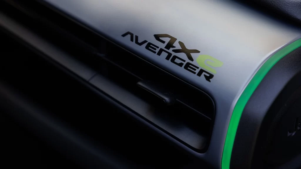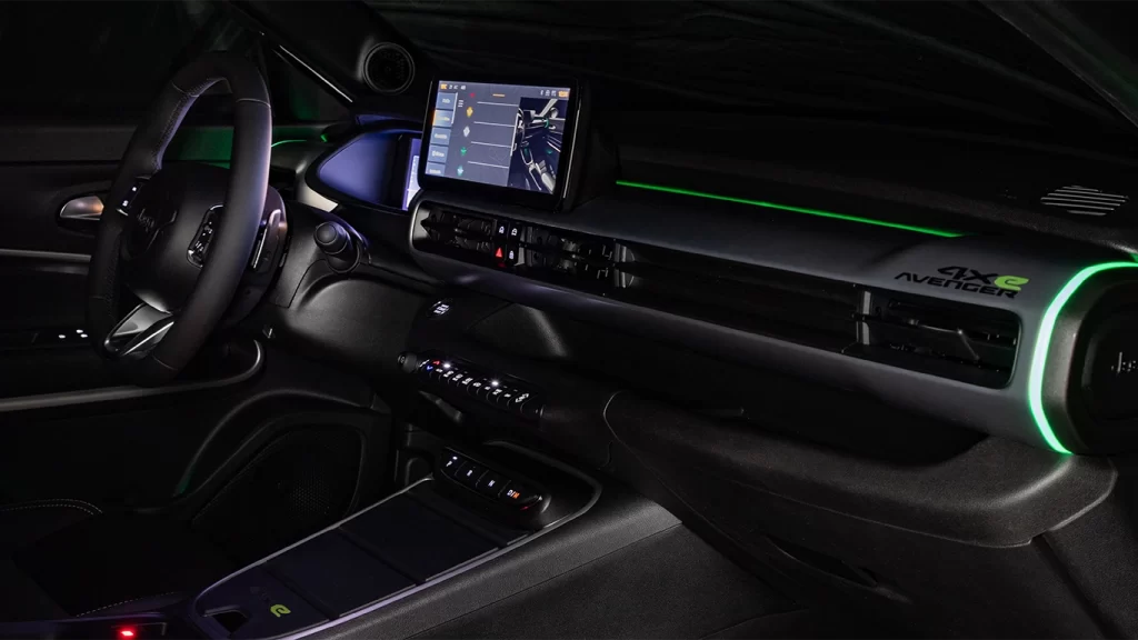 Inside, the Avenger prioritizes comfort and rugged appeal. The stylish cabin features a black headliner and waterproof materials that promise durability. The attention to detail—like the specific 4xe logo on the dashboard and multi-color ambient lighting—creates an inviting atmosphere that is ready for spontaneous road trips or off-the-grid adventures.