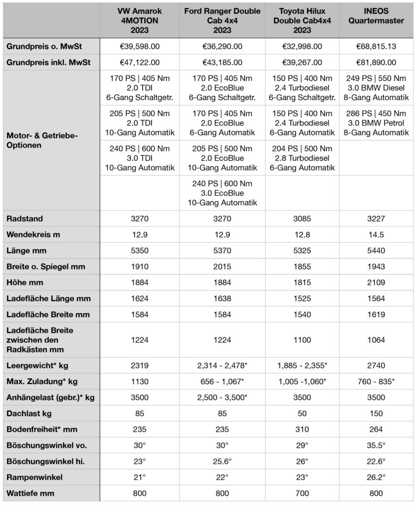 Den Kampf um die maximale Zuladung gewinnt der Amarok, der je nach Motorisierung 1.130 kg transportieren kann, während der Quartermaster mit 760 bzw. 825 kg eher enttäuscht.