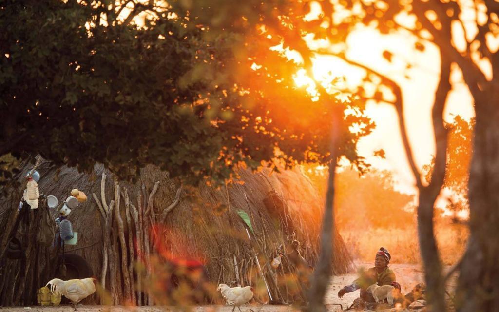 Wie sich herausstellte, hatte er recht. Es ist eigentlich undenkbar, dass Elefanten sich so weit südlich aus dem Okavango-Delta herauswagen, aber diese grauen Schönheiten sind einem derzeit wasserführenden Flussbett zufällig bis mitten in unser Camp gefolgt. Selbstverständlich sind sie keine Menschenfresser—da hatte ich etwas missverstanden—, aber aufgrund ihrer beeindruckenden Größe und ihrem regen Interesse an den Bäumen rund um unsere Zelte wirkten sie dennoch recht bedrohlich. Nach kurzer Beratung schlugen die Kua vor, dass wir unser Lager ins Dorf verlegen sollten, wo wir prompt von einer Meute „Wachhunde-cum-vierbeinige Tellerwäscher“ adoptiert wurden.