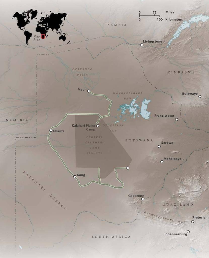 Zuvor in Maun hatten wir mit Jetlag und sperrigem Reisegepäck gekämpft, Kameraausrüstung und Vorräte für einen Aufenthalt auf unbestimmte Dauer im Central Kalahari Wildreservat (CKGR) geplant. Aus einem Tag Vorbereitung wurden zwei: Feilschen um die Fahrzeuge und ein Überfall auf den örtlichen Supermarkt; wir rissen Witze darüber, dass unsere acht prall gefüllten Einkaufswagen für ein hungriges Dorf ausreichen sollten. Da ahnten wir noch nicht, wie falsch wir damit lagen. Denn unsere künftigen Freunde aus dem Kua-Dorf hatten die gleiche Vorliebe für Chips wie Omar, unser Kriegsfotograf. Endlich kehrten wir der Stadt den Rücken und fuhren hinaus in die Kalahari, unsere Fahrzeuge randvoll mit Filmausrüstung, Campingequipment, Wasser für zwei Wochen, Ersatzteilen und -reifen sowie wechselndem Optimismus, Naivität und Aufregung.