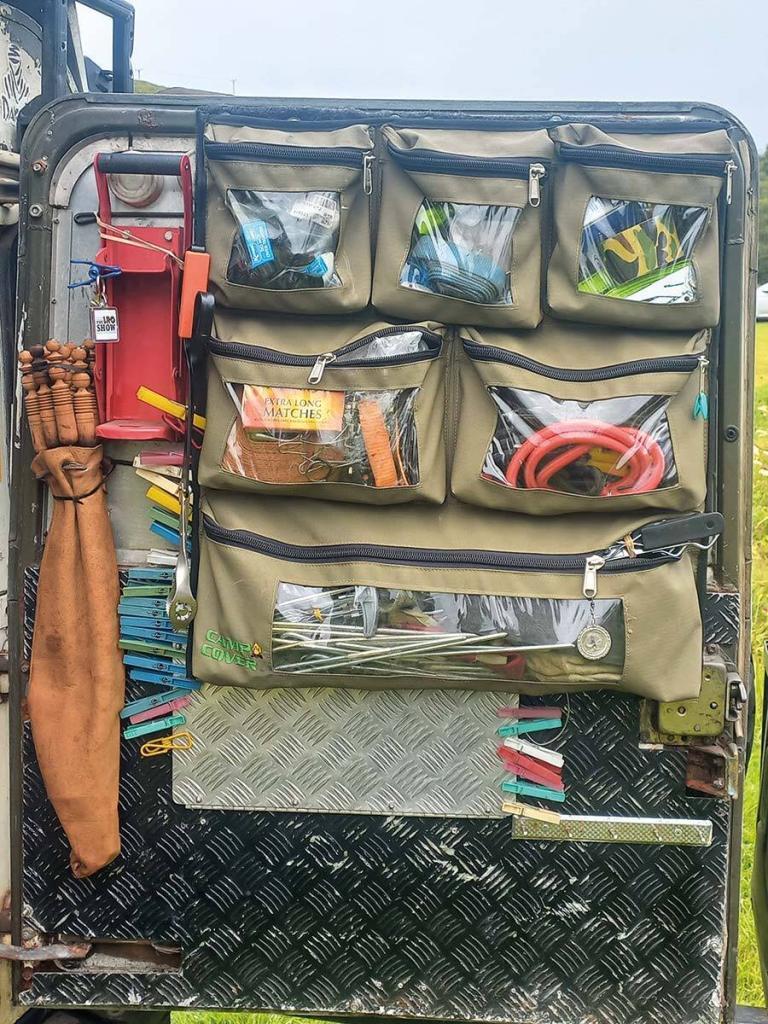 Small details were added—fold-flat transom steps from yacht chandlers gave unobtrusive roof access. Military-spec Spafax “indestructible” wing mirrors replaced standard units. Bush wires protected the windscreen from errant branches and undergrowth. A visor added over the windshield protected against glare when driving into the setting sun. Exmoor Trim canvas seat covers protected the vinyl seats and gave handy pockets for things like a fire extinguisher. Assorted pouches and pockets by Camp Cover were fitted around the vehicle for quick and easy stowage of the necessaries of camp life.