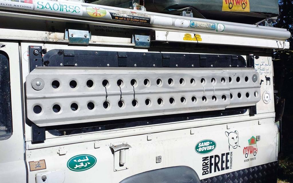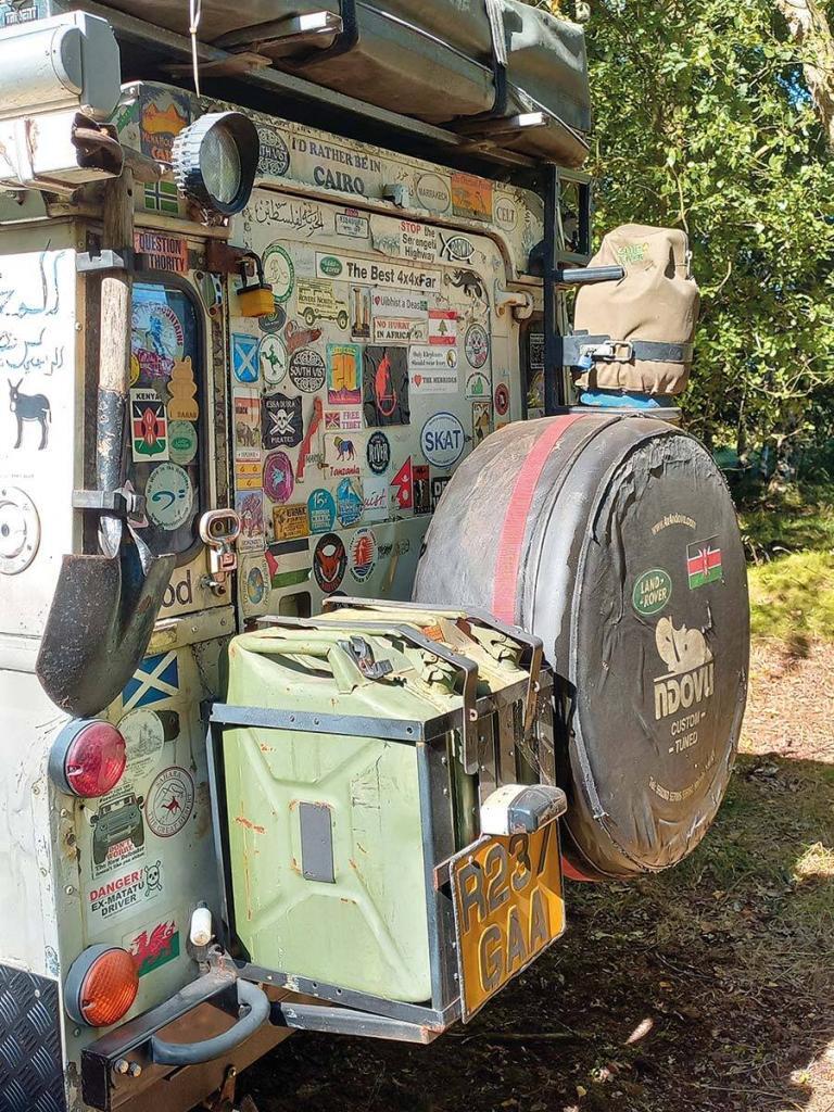 I had specified the custom rear spare wheel carrier as on long-distance remote area trips I prefer two spare tyres, and I also wanted to carry two jerrycans on the back (thanks to a blacksmith near the Pyramids in Cairo, she already has a twin jerrycan rack on one side of the body). One spare wheel goes on the bonnet, and I refuse to consider mounting one on the roof rack as it raises the centre of gravity uncomfortably high and the dynamic roof load rating on a Defender is surprisingly low.