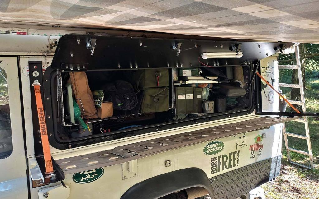 We were nearing completion. As a 110, Elsa had been fitted with a gullwing door bought as an external locker door from a motorhome shop (considerably cheaper, by a factor of ten, than buying a fancy version designed for a Defender); but now her rear body was much bigger, so I wanted a larger one. Turkish overland equipment specialists Rhino Overland took great delight in custom-building an enormous gullwing door that spanned almost the whole length of the 110 rear tub, and this was very straightforward to fit (although, until the lockers were fitted behind it, Elsa did rather look like a roadside burger van).
