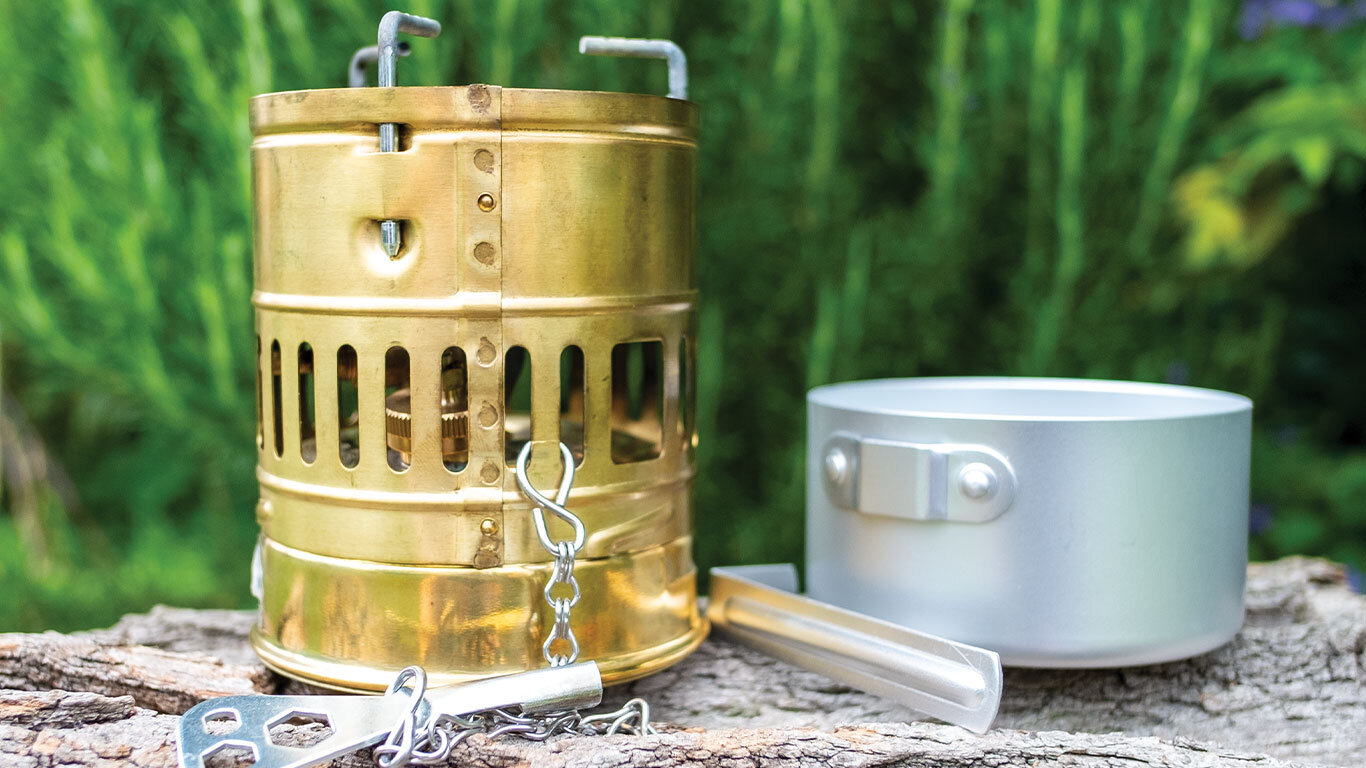 Turned upside-down with the handle attached, the aluminium cover doubles as a small pot—which I have never actually used. Cooking with the stove couldn’t be simpler: fill the tank to about two thirds with white gas (Coleman fuel) and close the lid; put a little fuel in the well at the base of the burner (an eye dropper is useful) and stand on a level surface, replace the windshield, put the key on the jet and turn fully to the right; ignite the fuel to prime the stove. Just before the flame dies down, turn the key to the left and the stove will ignite. Now just wait for it to develop its characteristic roar and you’re good to cook. You might need to practice this little ritual a couple of times.