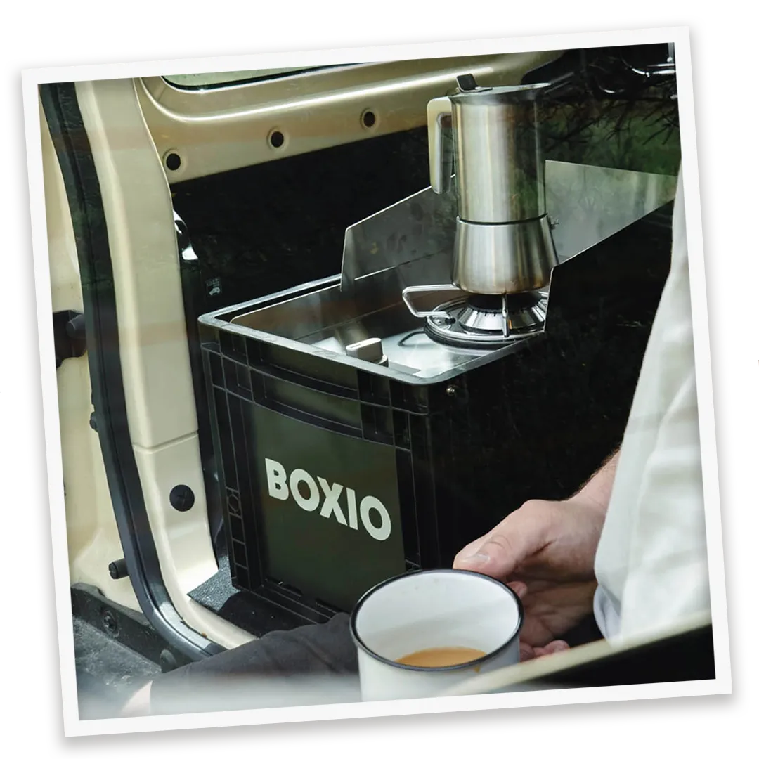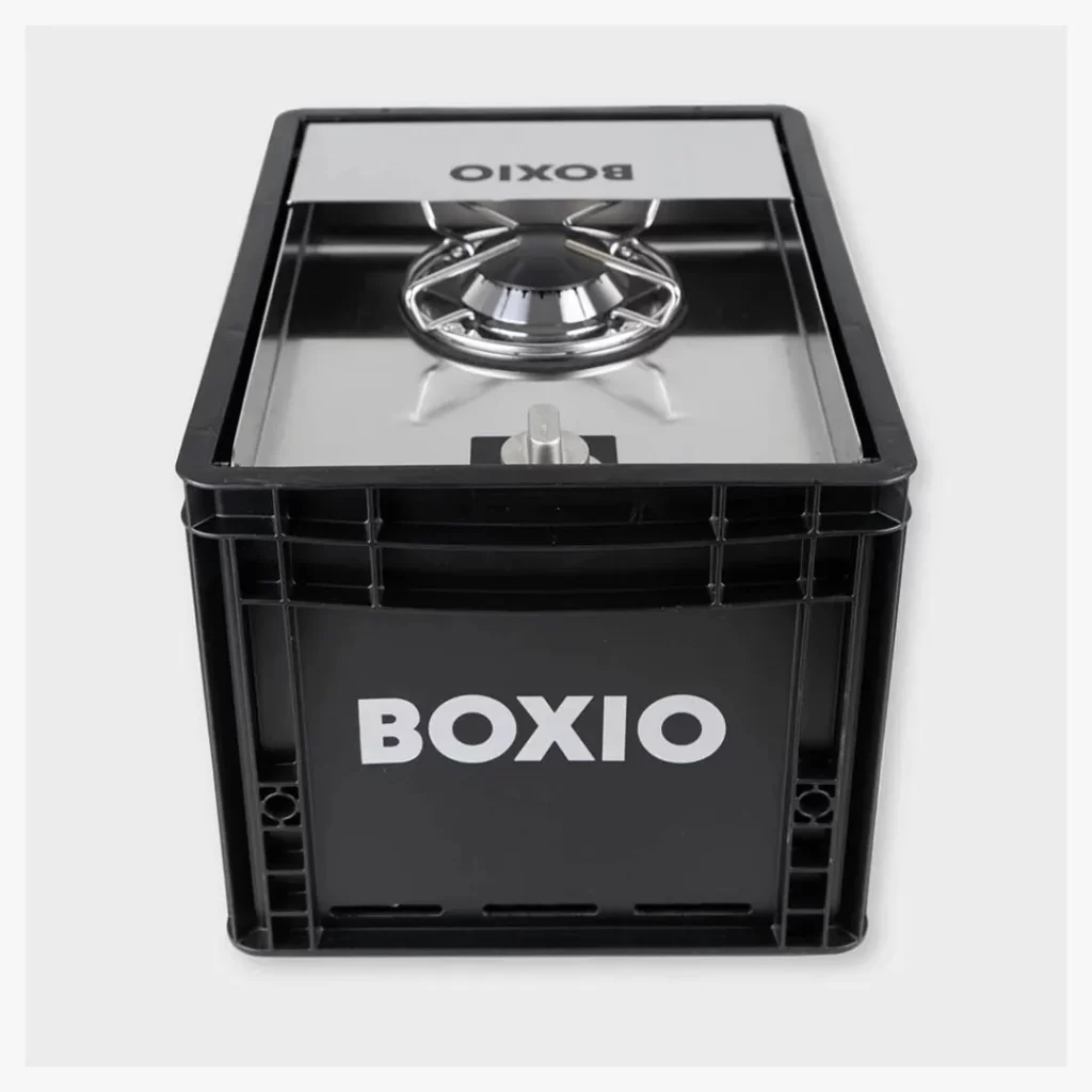 The BOXIO COOK is a premium gas stove for outdoor cooking. The practical design in the Eurobox combined with a stainless steel construction with adjustable gas flame and storage space for cooking utensils and gas cartridges (not included) ensures safety and convenience.