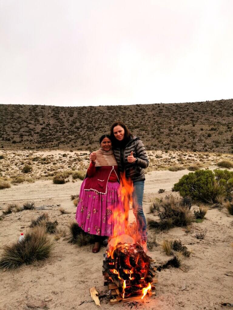 Elena and Carlos brought all the ingredients for the offering with them. We drove to a sheltered spot just below the base camp for Elena to perform the rituals. Carlos and Elena made a pyre and placed on top a platter of objects to be offered. Elena led the proceedings and included me in it. Nothing seems to happen without alcohol in these ceremonies (Pachamama likes alcohol, apparently). After the prayers, Elena and I in turn sprinkled 100% proof alcohol as an accelerant over the pyre, encircling in an anti-clockwise direction, followed by a small sip of the ‘rocket fuel’ It was enough to clear my lingering cold, at least for a short time! The fire was lit and we watched it burn.