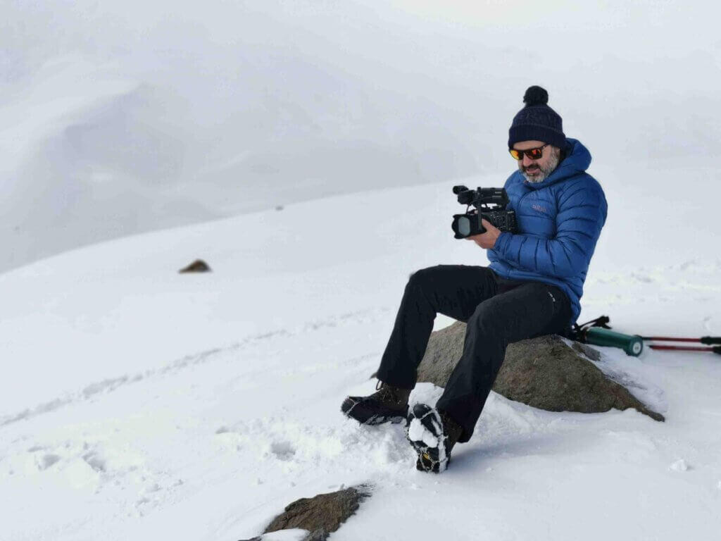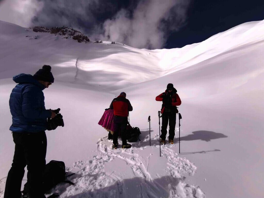 At around 5700m, we needed to climb a face with a 45% gradient to get to the ridge. The ice beneath the snow had started fracturing and was cracking underfoot. To ascend the steep slope, we needed to adopt a zig-zag path. As we crossed the face of the slope, the ice clearly was not holding our body weight. Analysing the conditions, Carlos said if we continued, there was a very real risk on an avalanche – something he’d had experience of before.