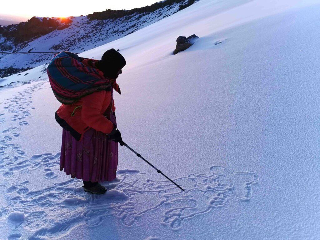 At some of our stops, Elena would break into dance, proudly twirling her skirt, accompanied by a tune Carlos would play from his phone. She also enjoyed sketching images in the snow with her walking pole.