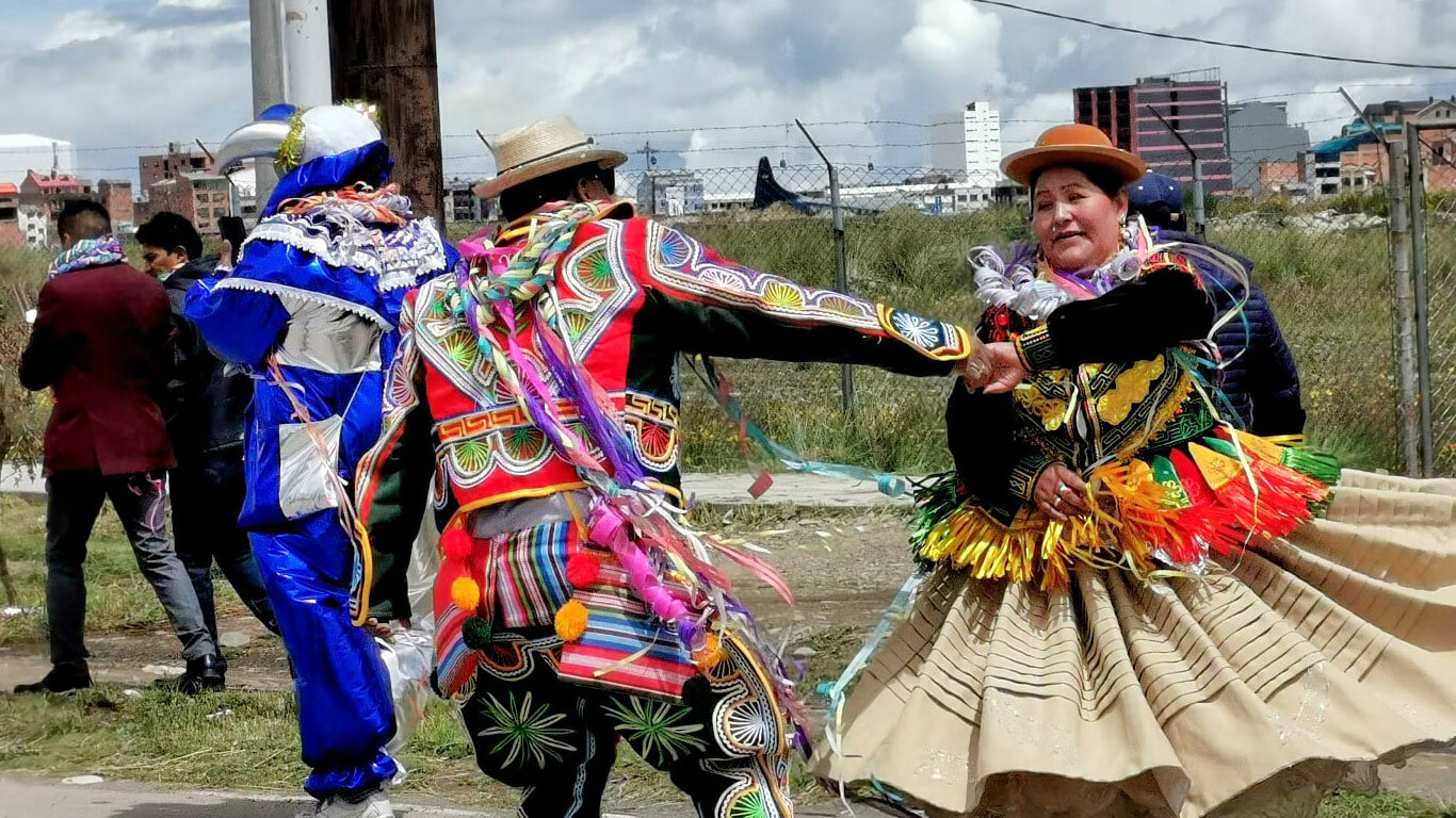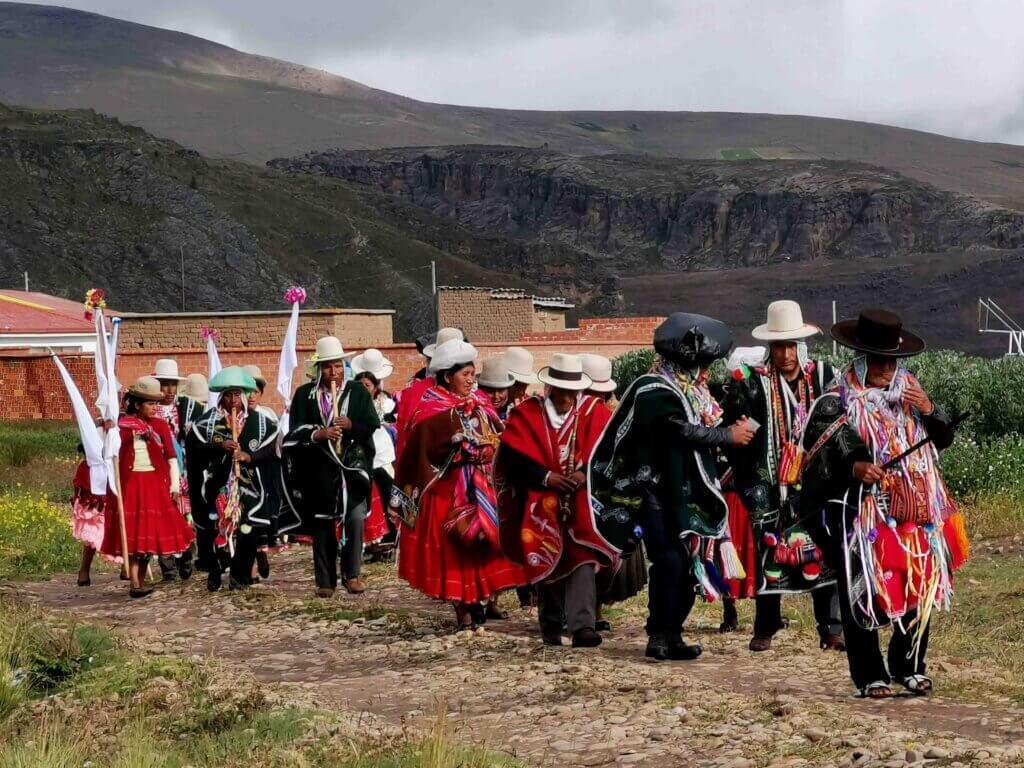 Day 2 and it is Festival season right across Bolivia and most of South America. We were invited by Elena Quispe (Cholita Escaladoras – more later) and her husband, Carlos to a traditional celebration near the northeast shore of Lake Titicaca. It required a five hour drive each way from Tiawanaku, but it was an opportunity we couldn’t miss. The remote village, Taypi Ayco is located in a valley set aside by the government to allow the local people to practice their traditional culture. The villagers arrived at the football field in a colourful procession and proceeded to dance and play music for about three hours.
