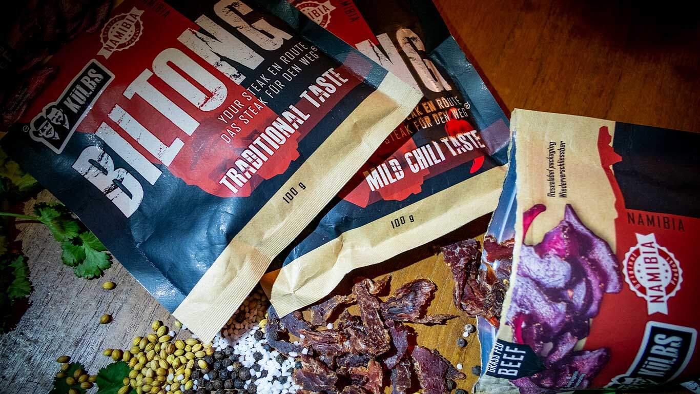 The Külbs brothers run a farm on the border of the Kalahari, in Namibia, and their business model is focussed on sustainability and upholding traditional values. The company’s mainstream products include steaks, burgers and other cuts of meat produced from home-grown, grass-fed beef. As far as Külbs’ Biltong is concerned, they use the indigenous method of drying, but on an industrial scale, lacking the romantic picture of small batches of meat cured in a family household.
