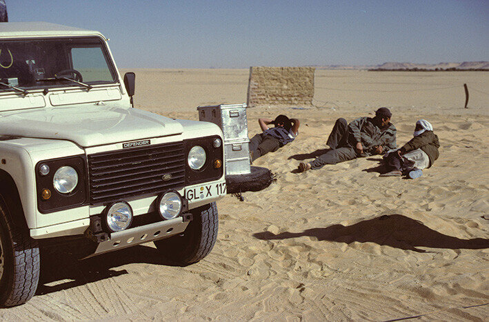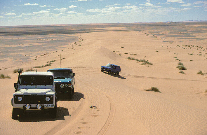 Es kann kaum noch die Rede vom Fahren sein, denn ein wilder Zick-Zack-Kurs mit Steilabfahrten bringt uns am Tag gerade einmal 20 km näher an unser Ziel. Jeder Meter wird vorher zu Fuß abgegangen, um keinen Kraftstoff zu vergeuden. Erstmals, nach mehr als 200.000 Kilometern Afrika-Erfahrung, stellt sich uns hier die Frage, ob wir Mensch und Maschine aus der Wüste herausbringen.