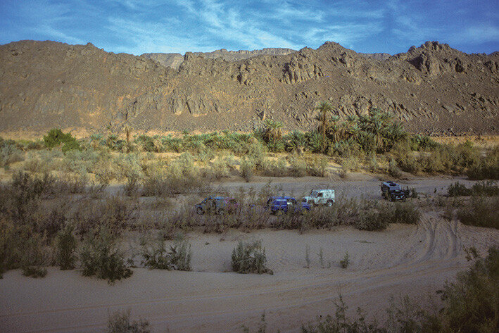 Wir verlassen die Ténéré in Richtung Norden über die legendäre Piste Balise Berliet, um dann wieder unbemerkt durch den Erg Admer zurück nach Algerien zu gelangen. Nicht über die leider mittlerweile entstandene Asphaltstraße, sondern im Oued Imhirou bewegen wir uns durch Weichsand, Felsen und dichte Büsche in Richtung Illizi. Die alte Piste ist total zugewachsen, weicher Schwemmsand lässt die Fahrzeuge bis zur Radnabe einsinken. Aber eine heiße Quelle im Oued entschädigt uns. Mal ehrlich, es gibt bedeutend schlechteres, als die letzte Flasche Whisky der Reise unter dem sternenklaren Saharahimmel im warm sprudelnden Wasser sitzend zu genießen.