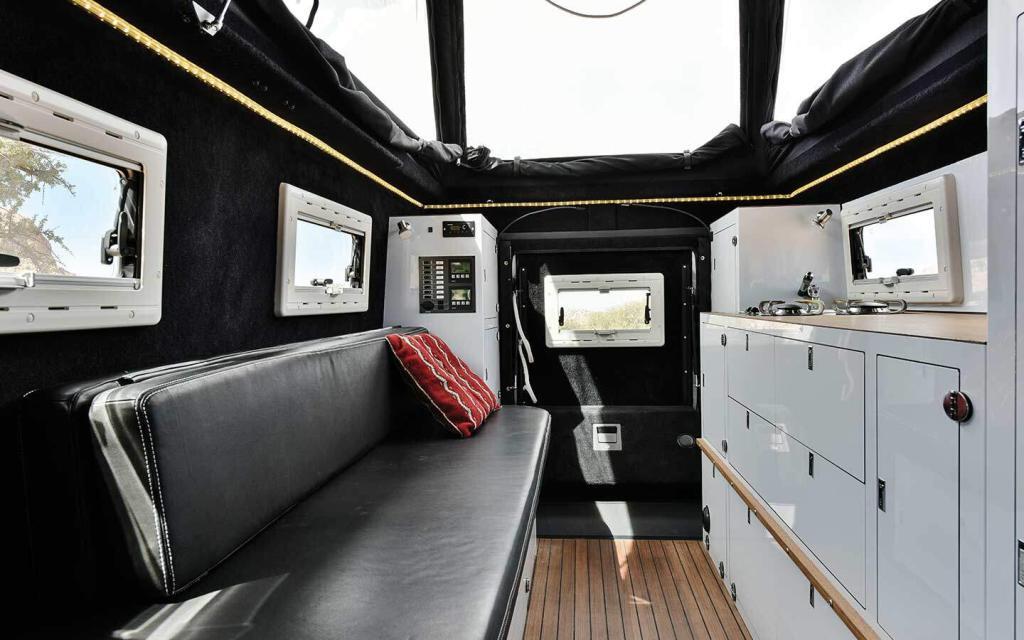 The cabin, made of 26/28 mm carbon fiber and closed-cell rigid foam, has a pop-up roof with a large zippered mesh window. Each sidewall has two tilting windows and there’s another in the back door. The rear cross member is reinforced to accommodate a trailer hitch.