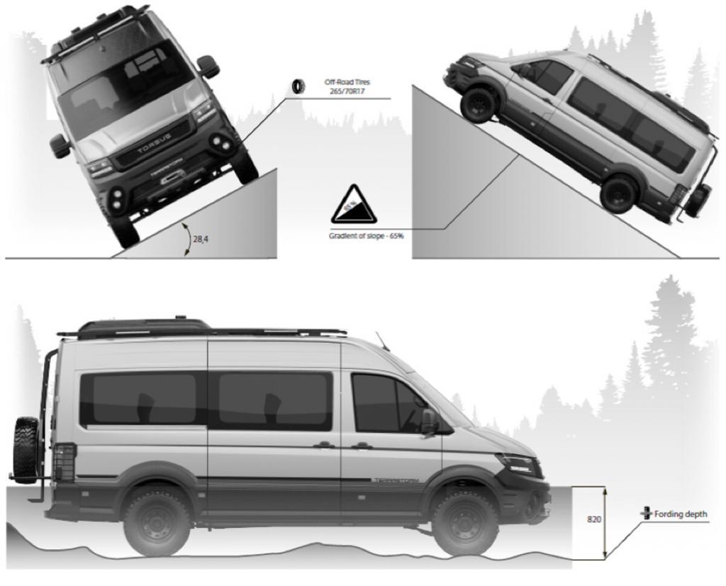 The 4×4 TORSUS TERRASTORM, based on a Volkswagen Crafter/MAN TGE 4Motion chassis, features a EURO VI D 2.0-litre bi-turbo diesel engine offered in two power guises, 140PS (103kW) and 340Nm or 176PS (130kW) and 410Nm, mated to a six-speed manual or an eight-speed automatic transmission.